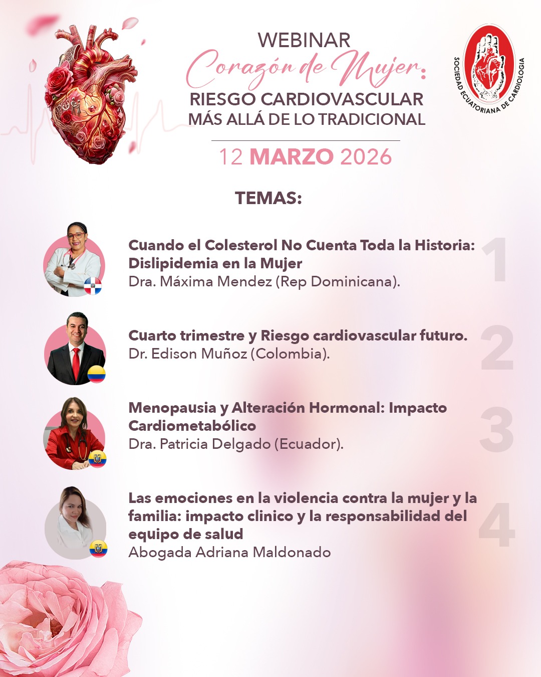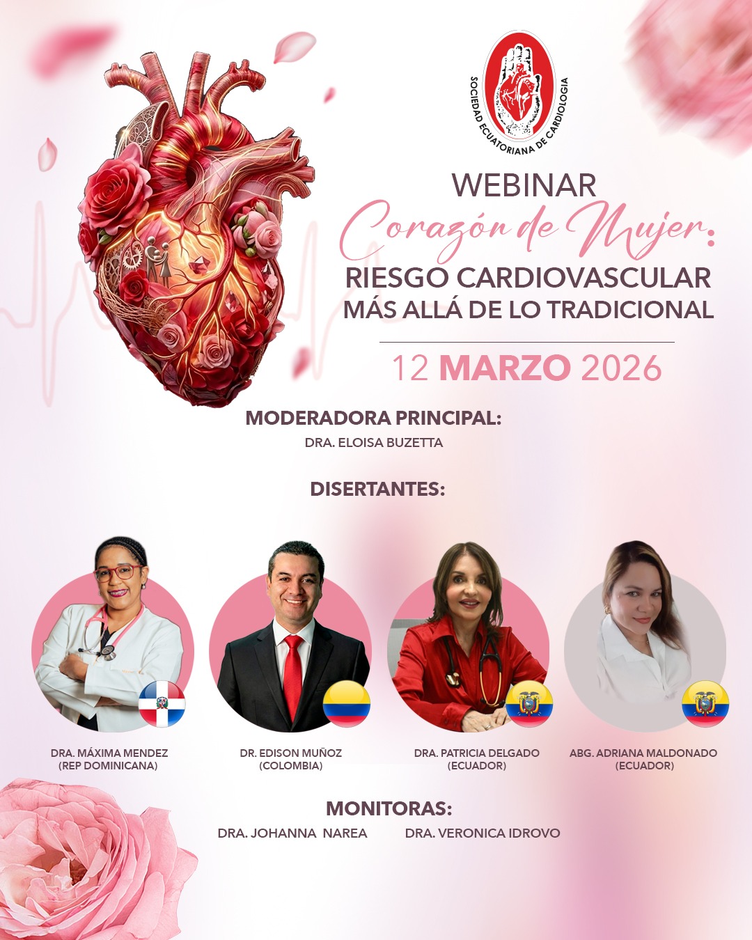 La Sociedad Ecuatoriana de Cardiología invita a todos sus miembros y profesionales de la salud al webinar «Riesgo Cardiovascular más allá de lo tradicional». Contaremos con la participación de destacados disertantes de República Dominicana, Colombia y Ecuador para discutir las particularidades del riesgo cardíaco en la mujer.